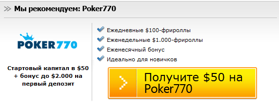 PokerStrategy – крупнейшая русскоязычная онлайн школа покера – вместе с ценными знаниями, дарит вам бездепозитный бонус $150 абсолютно бесплатно. Получить бонус можно частями $50+$100 в любой из двух покер румов: Poker770 и PartyPoker. Вы всего лишь сдаете несложную викторину и получаете бесплатные деньги для игры.